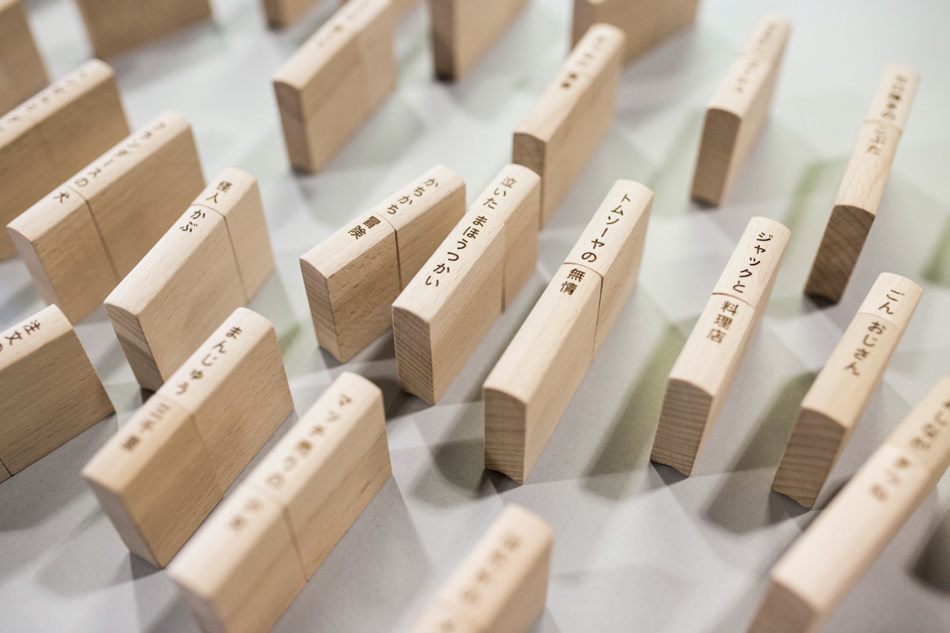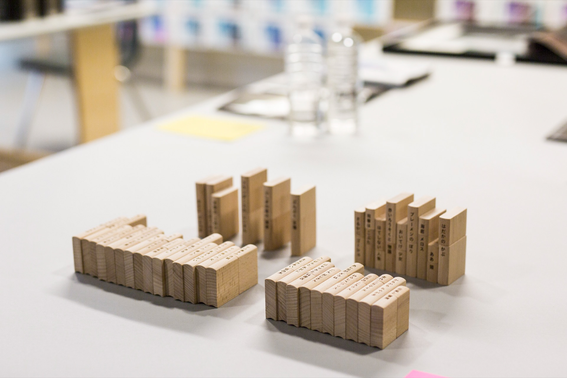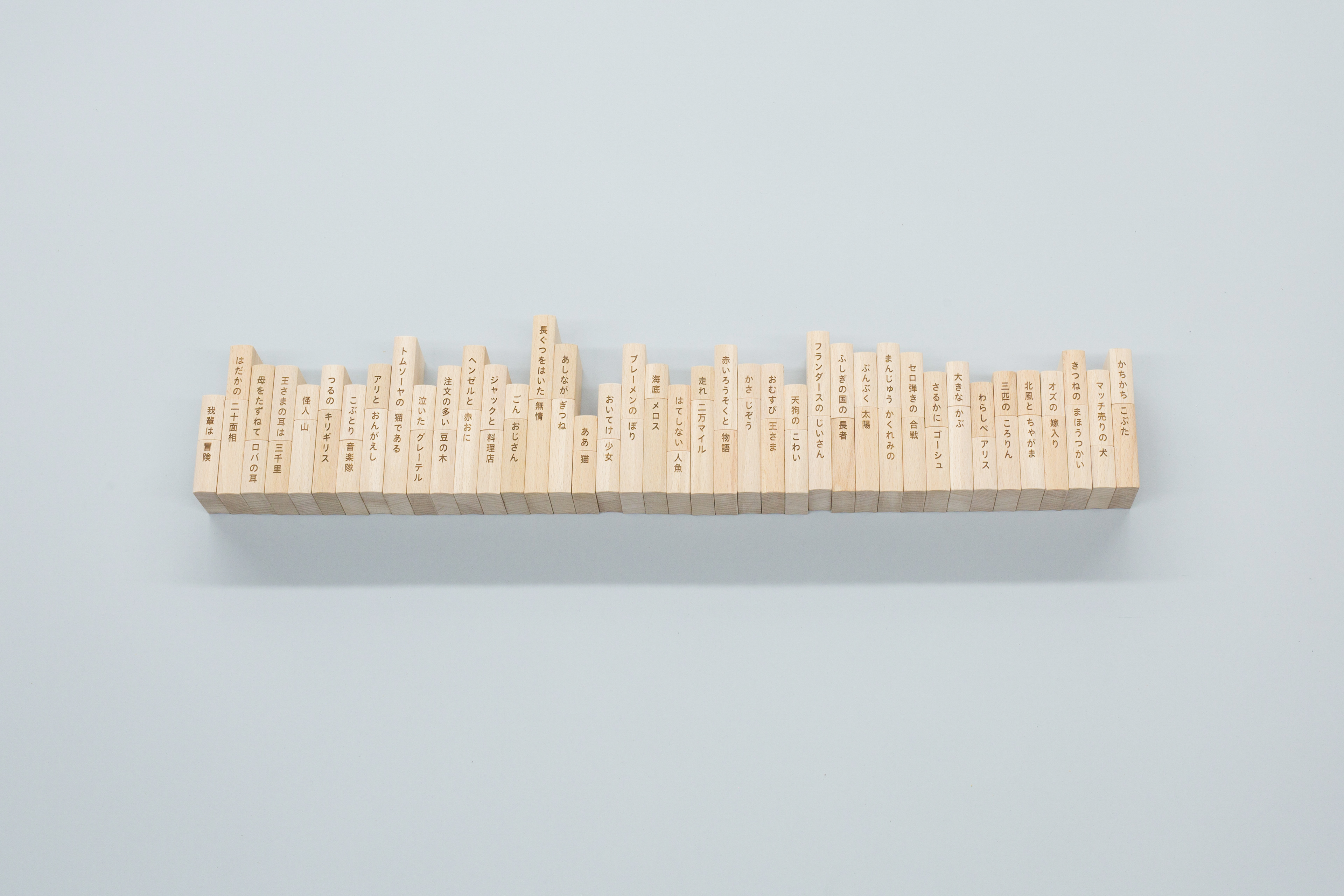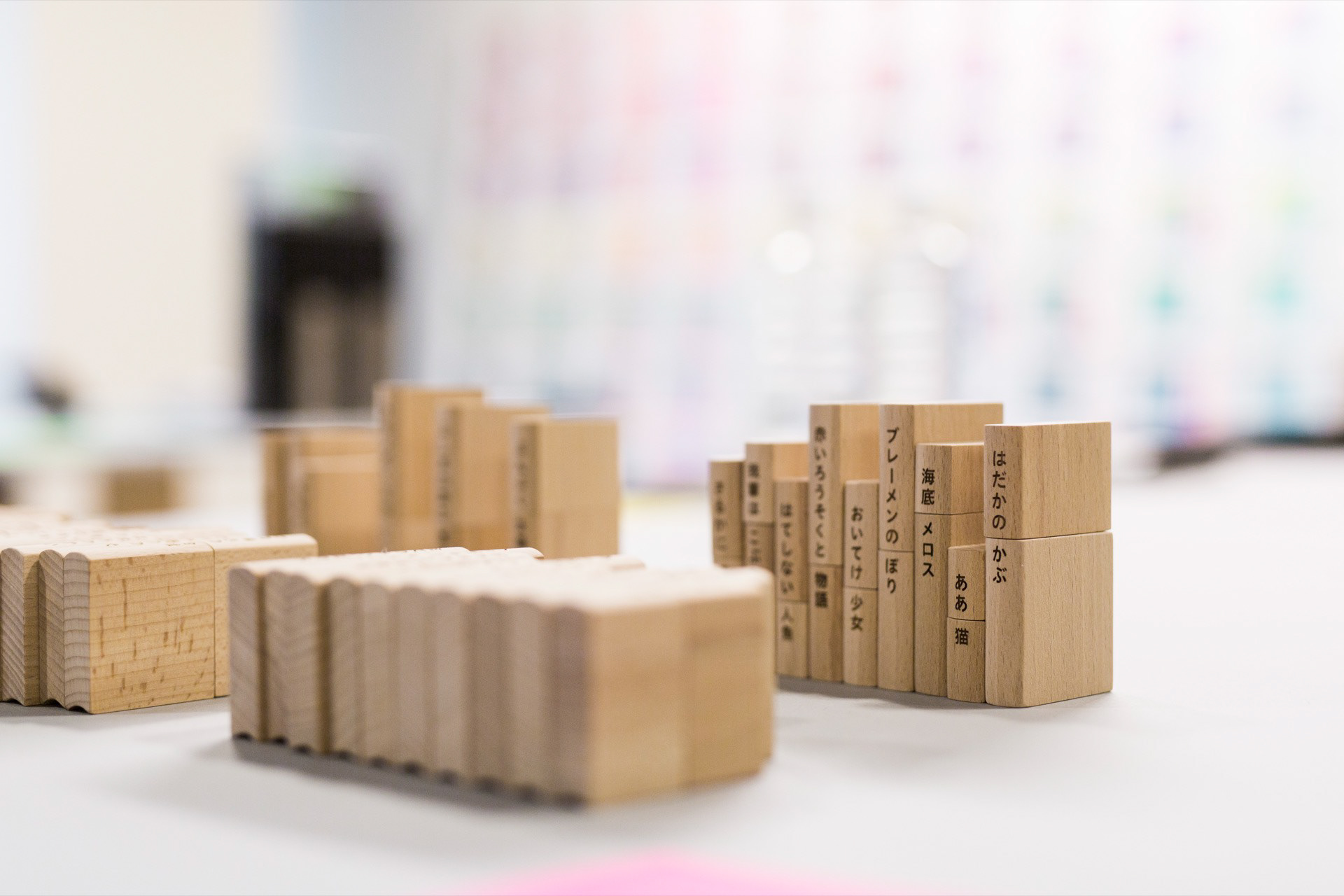 本のタイトルの上下を組み替えて新しいタイトルを作って遊ぶ積み木。2013年に「デザインあ展」21-21designsightで発表したものをリサイズしました。