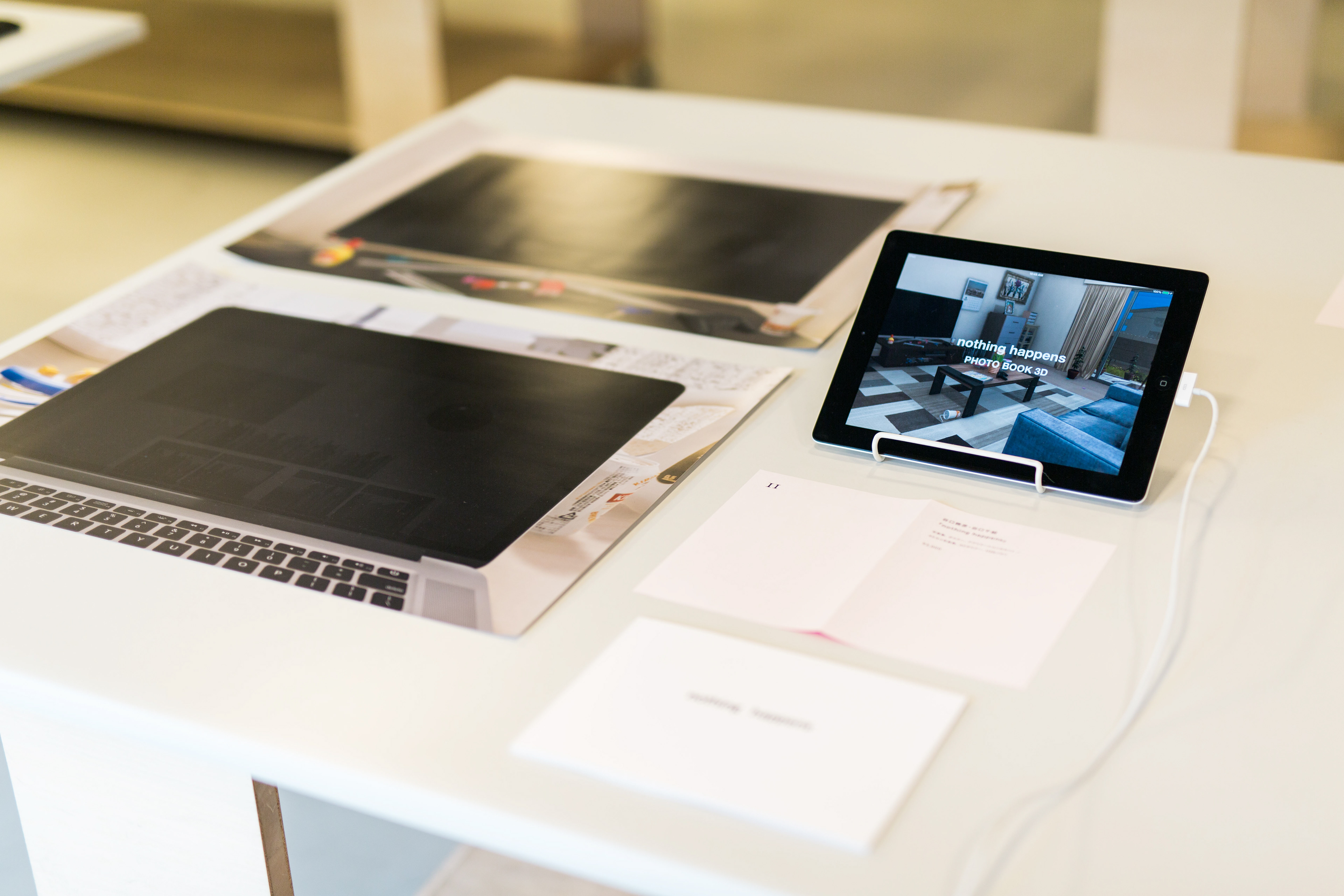 「何も起きない」という、2017年に発表した映像インスタレーション作品を、ポスターや写真集、アプリケーションへと形を変えて展示・販売します。この作品では、架空の街の中で日用品で構成されたキャラクターたちが生活する様子を観ることができます。それは、あらかじめプログラムされたアルゴリズムによって、今この時をシミュレーションされた結果として生まれた風景です。私たちの世界と並行して存在するその街で、彼らは、朝になると目覚め、夜になると休み、二度とは繰り返されない、しかしプログラムに書かれた可能性以外のことは何も起きない日常を過ごしています。今回は、この作品の世界を別の角度から切り取った写真集、作品の中で象徴的に描かれているテレビやパソコンを写したポスター、そして、写真集をより楽しく閲覧するためのアプリケーションの3つの要素で「何も起きない」という作品を別の角度から体験することができます。