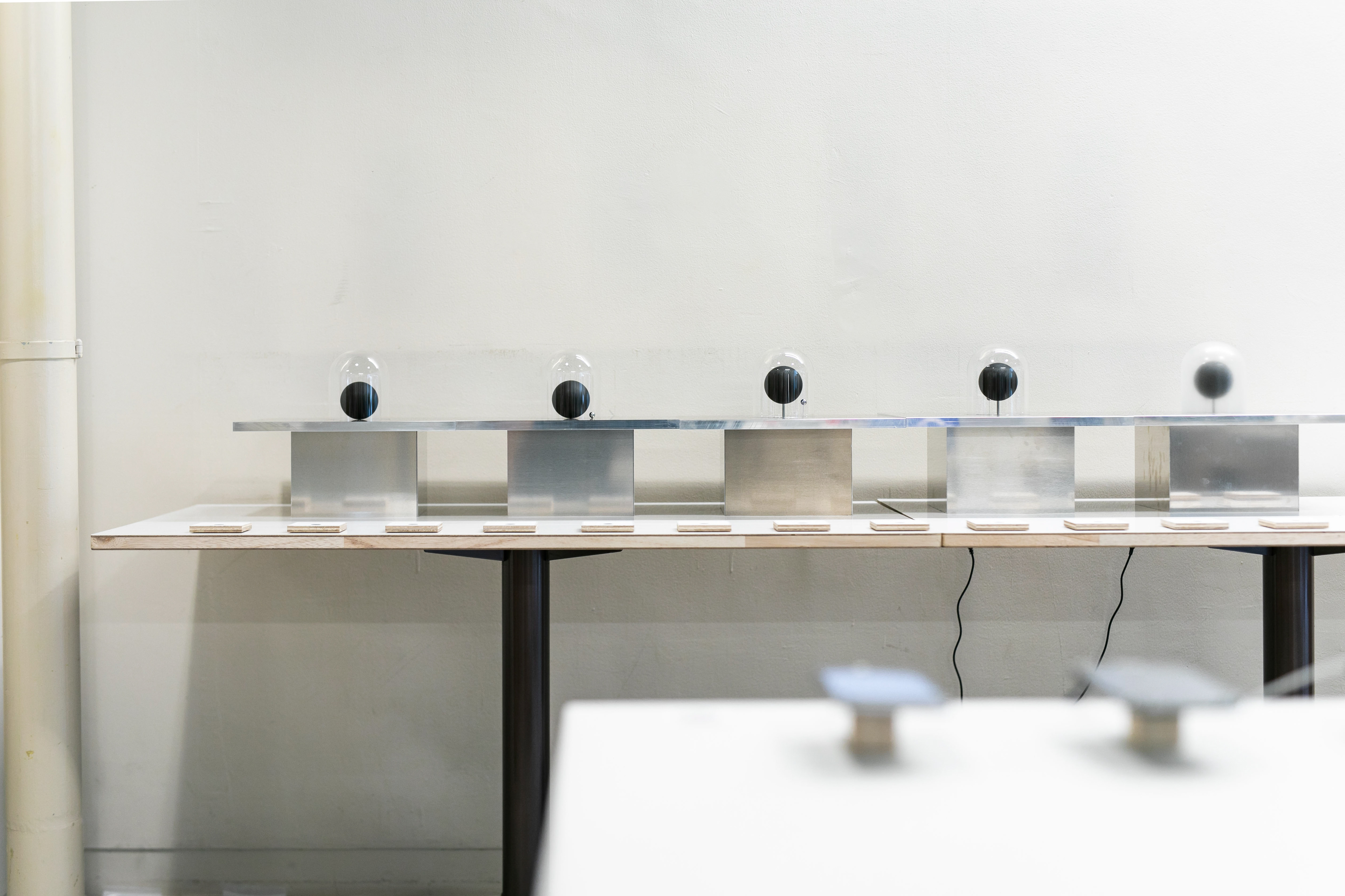 大小2つの球体がそれぞれ任意の速度で周期運動をする、時計のような抽象的なプロダクト「Q/period」のコンセプトモデルと、そこに至るまでの諸バージョンを展示します。太陽の周りを地球が、地球の周りを月が、そして地球上で私たちが世代を超えて一生~一日という周期を繰り返し続けているように、世界は大小の運動の関係性のうちに存在します。エイゼンシュテインは本のあらゆる部分が関係性を持ち合う「球体の本」を夢想していました。このプロダクトは、抽象性に意味を見出す本のインタラクティブな構造を活用しつつ、あらゆるものがつなぎあわせる球体たちの周期運動のうちに、鑑賞者が自らの個人的な物語を紡ぐことを誘う装置です。