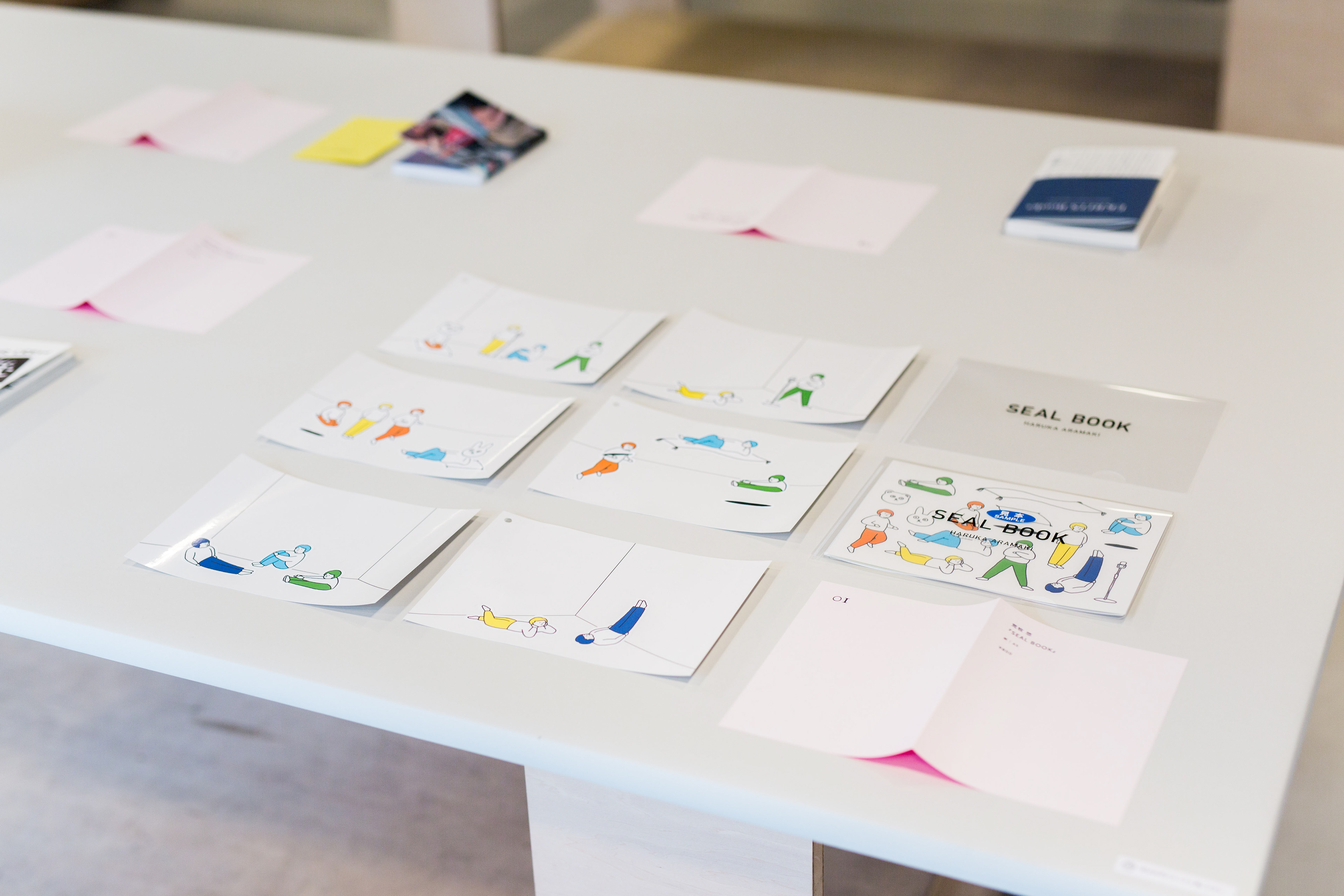 紙にシールを貼ってたのしむ本です。本は「あるテーマによって束ねられているもの」で、「読者や鑑賞者の解釈の上に成り立つ」ものという理解から、工夫を加えることができ、やりとりのできる不完全な本としてシールブックを考えました。紙に描かれた線は、部屋の隅になったり、天井になったり、壁の境になったり、地平線になったりします。人の配置によって意味合いが変わり、また、マイクを置くと途端にステージになり、絨毯で空を飛んでみたりと道具との組み合わせで情景の切り替えの早さに驚きます。漫才をしているところなのか、だとしたらなんとぼけてつっこんでいるのかと想像しますし、ただゴロゴロしている様子の人は、自分も一瞬ゴロゴロしているような感覚を想像できるかと思います。
